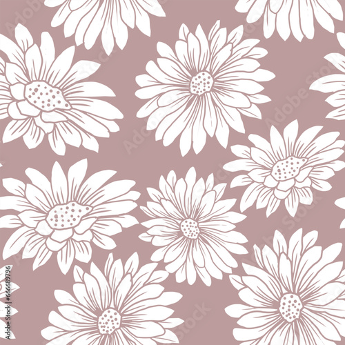 Abstract chrysanthemum flowers seamless pattern. summer garden flower on purple background. Hand drawn illustration.