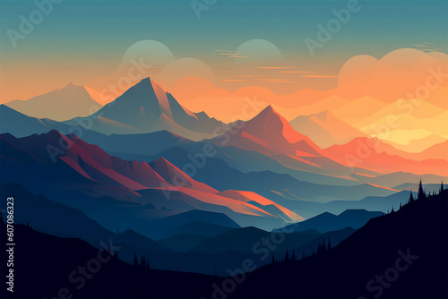 abstract, colours, mountain, landscape, vibrant, illustration, art, sunset, sky, sunrise, nature, sun, dusk, travel, evening, morning, cloud, silhouette, orange, blue, yellow, red, light, summer, wallpaper, beautiful, view, horizon, hill, design, element, generative, ai