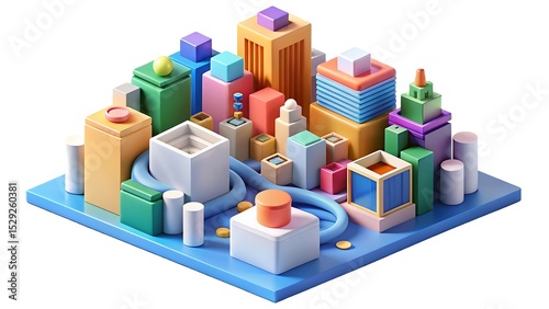 three-dimensional, city, city landscape, model, abstract, colourful, geometric, shape, block, building, architecture, design, illustration, rendering, isometric, modern, urban, background, white, isolated, on, vibrant, creative, minimal, style, blue, yellow, pink, green, orange, purple, pastel, bright, view, landscape, building