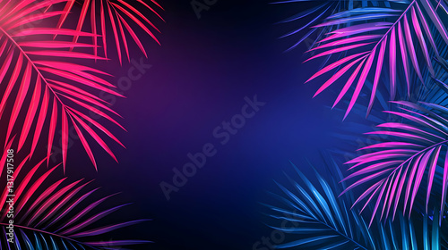 Abstract composition featuring glowing neon palm leaves in shades of blue and pink arranged at the corners against a dark background ideal for