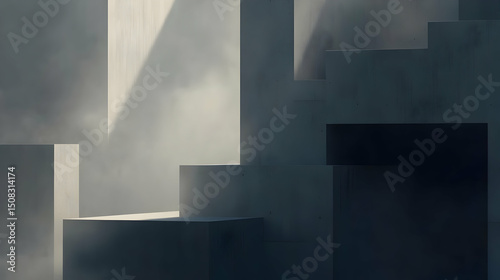 concrete, cube, architecture, geometric, modern, industrial, grey, white, light, shadow, fog, mist, sunlight, minimalist, three-dimensional, digital, design, abstract, still life, interior, scene, texture, block, shape, structure, empty, background, empty space, perspective, studio, still, interior design, contemporary, industrial design, architectural, rendering, digital artwork, modern architecture
