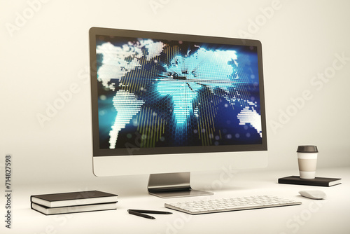 Abstract creative digital world map on modern laptop monitor, tourism and traveling concept. 3D Rendering
