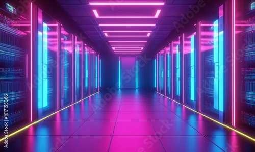 Abstract data center room with bright neon blue and pink light glowing server blocks