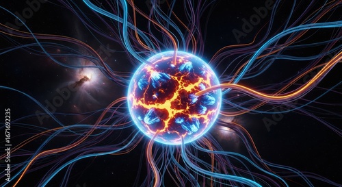 Abstract depiction of a glowing orb with electrical energy currents in deep space