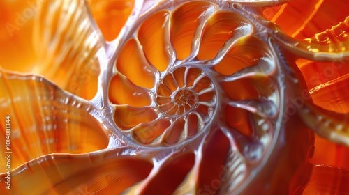 Abstract depiction of a nautilus shell, focusing on its detailed swirl. The shell's natural patterns are beautifully displayed in this art piece.