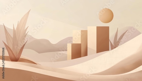 desert, landscape, abstract, geometric, form, plant, dune, sand, beige, brown, tan, ocher, cream, pastel, minimalist, artistic, serene, calm, peaceful, tranquil, soft, smooth, elegant, stylish, sophisticated, modern, contemporary, background, texture, design, illustration, graphic, art, nature, organic, shape, sphere, column, elevation, muted, tone, hue, colours, palette