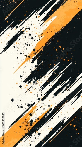 Abstract design featuring dynamic brush strokes in black, orange, and white.