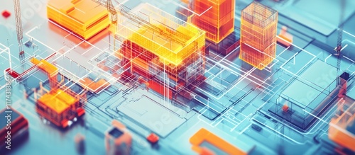 Abstract digital cityscape with geometric shapes and glowing lines in red, orange, and yellow.