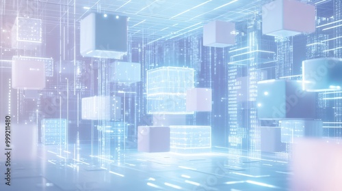 Abstract Digital Cityscape with Holographic Cubes and Data Streams - Futuristic Technology Background.