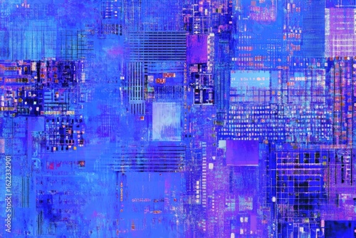 abstract, digital, collage, fragmentation, geometric, pattern, colours, blue, purple, pink, tech, circuit, grid, line, shape, square, rectangle, texture, pixel, noise, graphic, art, modern, design, visual, composition, patterned, technology, fragment, intricate, layered, vibrant, dynamic, colourful, impressionistic, background