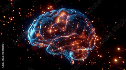 Abstract digital illustration of a human brain with glowing lights, representing artificial intelligence, neural networks, and futuristic technology.