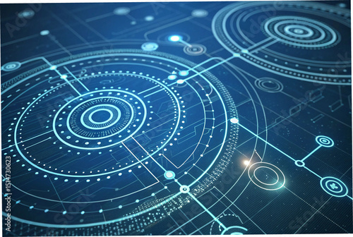 Abstract digital illustration of interconnected circuit patterns and lines.