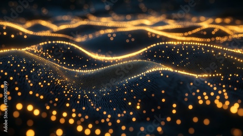 abstract, digital, landscape, glowing, line, particle, light, wave, dark, background, technology, futuristic, modern, design, graphic, art, texture, pattern, motion, dynamic, energy, flow, movement, vibrant, bright, shimmer, sparkle, gold, orange, black, depth, perspective, space, infinite, cosmos, galaxy