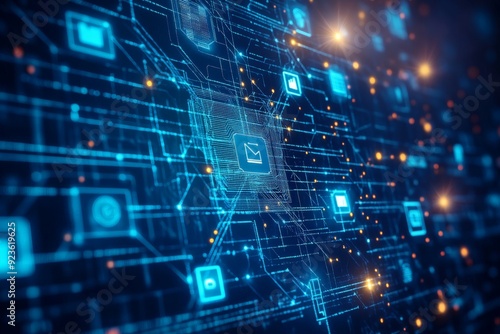 Abstract digital network communication concept with various icons and blue lines highlighting data exchange and connectivity.