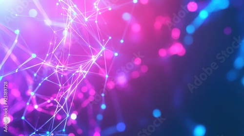 Abstract digital network connections with glowing nodes and lines in blue and pink colors. Futuristic technology background.