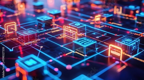 Abstract Digital Network: Glowing Cubes and Lines Representing Data Transfer and Connections in Cyberspace