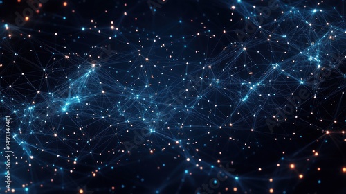 Abstract digital network of interconnected glowing nodes and lines on a dark background representing data flow and connectivity