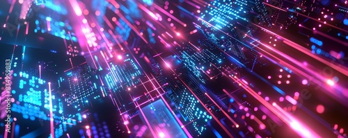 Abstract digital technology background with vibrant neon lights and data streams, perfect for high-tech designs and futuristic concepts.