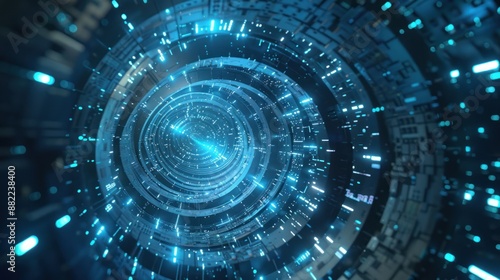 technology, abstract, digital, futuristic, science, network, connection, datum, information, future, artificial, intelligence, virtual, reality, cyberspace, innovation, progression, fiction, space, hyperspace, three-dimensional, rendering, optical, graphic, design, art, blue, neon, glow, light, geometric, shape, circle, line, pattern, texture, background, concept, illustration