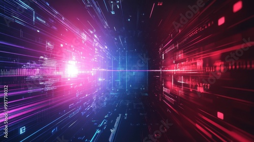 abstract, digital, tunnel, red, blue, light, glow, neon, futuristic, technology, science, datum, information, network, code, binary, cyberspace, virtual, reality, space, galaxy, universe, line, pattern, grid, speed, motion, dynamic, energy, bright, vibrant, dark, background, design, graphic, modern, contemporary, illustration