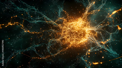 abstract, digital artwork, explosion, energy, particle, dot, light, glow, orange, teal, dark, space, universe, pattern, texture, science, technology, futuristic, modern, graphic, design, artistic, visual, composition, colourful, geometric, dynamic, motion, abstract art, graphic design, illustration, glowing, sparkling, energetic, abstract background