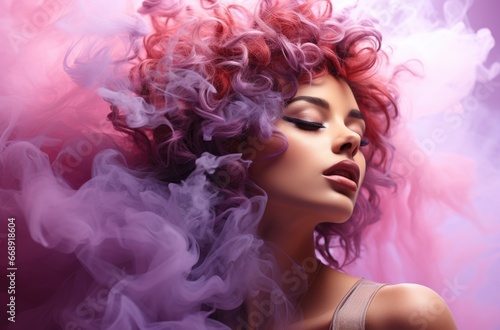 Abstract fashion makeup concept with caucasian girl in purple pink cloud of smoke on isolated pastel blue background. Close-up portrait of top model