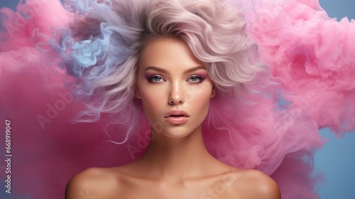 Abstract fashion makeup concept with caucasian girl in purple pink cloud of smoke on isolated pastel blue background. Close-up portrait of top model