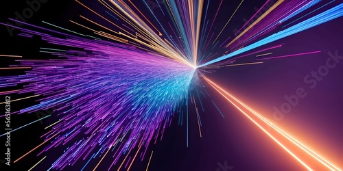 Abstract fiber optic lines with particles colliding, blue pink and orange CGI concept render, AI generated.