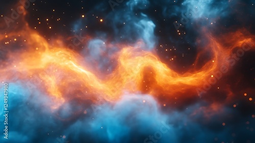 fire, ice, nebula, cosmic, swirl, abstract, orange, blue, flames, smoke, energy, power, light, dark, space, galaxy, star, dust, particle, glowing, vibrant, intense, contrast, texture, background, pattern, design, art, digital, illustration, fantasy, magical, mystical, aethereal, dreamlike, hypnotic, captivating, awe, wonder, beauty, serenity, chaos, harmony