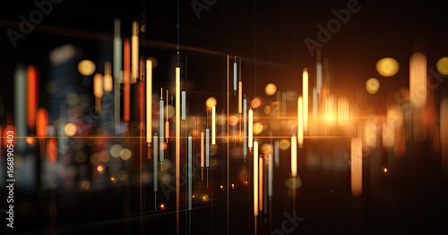 Abstract financial data visualization with glowing orange and white vertical bars against a dark city bokeh background