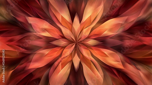 Abstract floral symmetrical pattern with vibrant shades of orange and red.