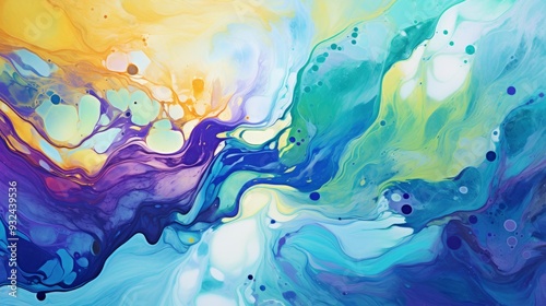 Abstract fluid art with vibrant swirls of yellow, blue, purple, and green creating a dreamy background , ai