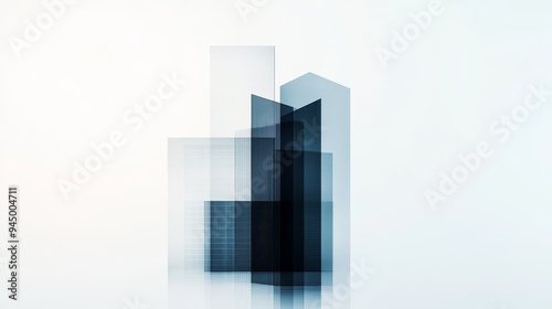 Abstract forms intersecting with minimalist high-rise buildings, presented in a layered double exposure technique, bold and dynamic