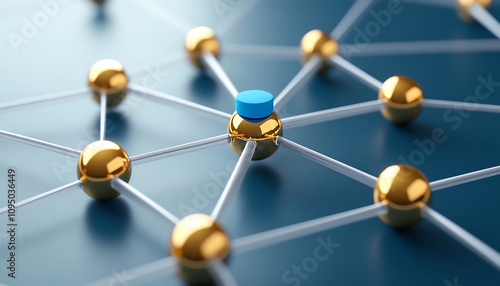 Abstract fractal designs. 3D abstract network with golden spheres and blue node, symbolizing connection and communication in technology