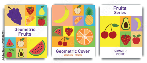 Abstract fruit posters. Geometric fruit mosaic. Summer patterns with fruits and berries. Set of vector banners. Grocery leaflets.