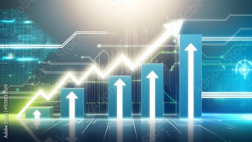 Abstract Futuristic Concept Symbolizing Success and Achievement with Glowing Arrows, Rising Charts, and Digital Circuit Lines, High-Tech Background Neon Blue White and Green Glows