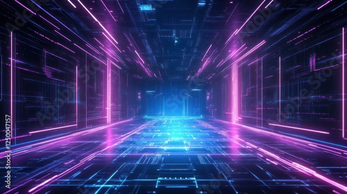 Abstract futuristic cyberpunk gaming background with digital retro glowing blue and purple neon lines wallpaper AI generated image