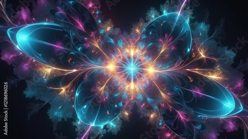 Abstract futuristic design of luminous particles scattering in a symmetrical fractal pattern, iridescent colors, detailed 3D rendering, glowing technological aesthetic with depth and texture variation
