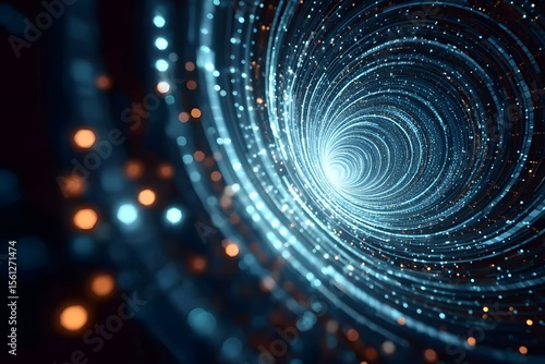 Abstract futuristic digital background with a glowing spiral tunnel, representing data transfer and technology concepts.