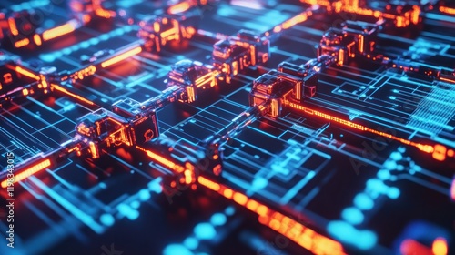 circuitry, digital, technology, network, future, abstract, neon, orange, blue, glowing, line, datum, system, grid, electronic, computer, hardware, software, innovation, progress, science, design, artistic, graphic, three-dimensional, rendering, model, visualisation, complex, intricate, geometric, pattern, shape, light, energy, modern, contemporary, stylish, vibrant