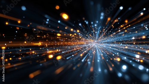 Abstract futuristic digital tunnel with glowing lights and a data transfer concept background, high-speed moving lights in dark blue, orange, and white colors. Abstract background.