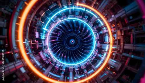 Abstract Futuristic Turbine Engine Neon Lights and Complex Machinery Design