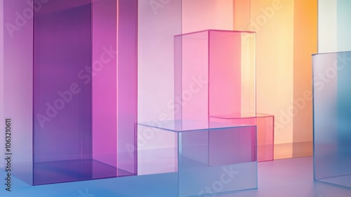 abstract geometric background, translucent glass with violet pink blue gradient, simple square shapes