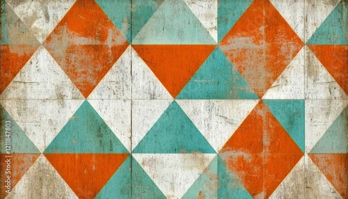 abstract, geometric, pattern, design, triangle, orange, teal, turquoise, white, beige, off-white, cream, distressed, vintage, retro, textured, background, surface, wall, art, graphic, modern, contemporary, style, decor, home, interior, fashion, textile, wallpaper, print, illustration, grunge, aged, faded, rustic, paint, colours, shape, line, composition, aesthetic, imagery