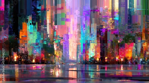 city landscape, night, abstract, colourful, glitch, pixelated, urban, building, water, river, bridge, art, digital, modern, futuristic, vibrant, high-coloured, evening, city, architecture, landscape, urban scene, digital artwork, abstract art, modern art, artistic, creative
