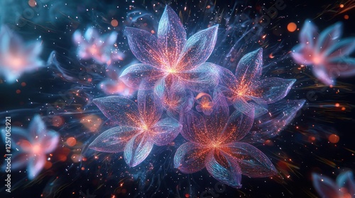 flower, digital, abstract, glowing, dot, floral, pattern, light, colours, art, design, beautiful, pink, blue, orange, red, purple, sparkle, particle, texture, nature, high-coloured, modern, illuminated, many-coloured, abstract flower, digital artwork, floral pattern, technology, futuristic, three-dimensional