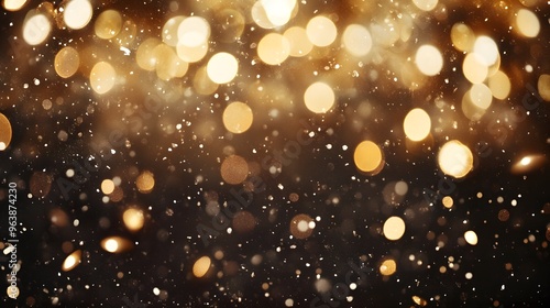 Abstract Gold Bokeh with Falling Snowflakes on Dark Background