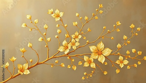 Abstract gold floral branches on canvas; oil paint texture, botanical, visual art