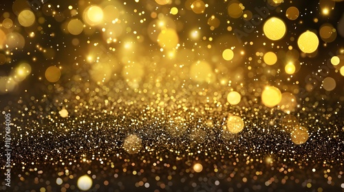 Abstract golden bokeh lights and glitter on black background.