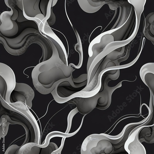 Abstract grayscale swirls: A mesmerizing dance of smoke-like forms against a dark backdrop. The fluid shapes create a sense of movement and depth, evoking feelings of mystery and wonder.